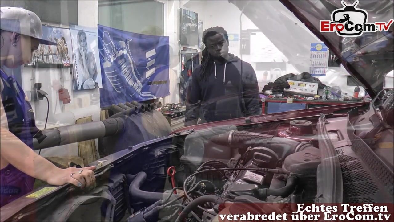 2 German female car mechanics fuck with a black man with a huge cock